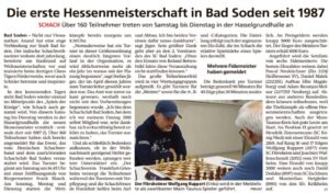 Die offene Hessisches Einzelmeisterschaft findet vom 27. – 30. Dezember bei uns in der Hasselgrundhalle in Bad Soden statt! Alle Informationen zur HEM:https://www.hessischer-schachverband.de/spielleitung-einzel/hem/hem-2025/hem-2025 Anmeldung: Überweisung an: Hessischer Schachverband e.V., DE40 5139 0000 0069 7150 01Verwendungszweck: ”HEM + Name,Vorname + FIDE-ID“ E-Mail mit Namen und Fide-Kennung an Stefan Jäger: tlfe@hessischer-schachverband.de Es gilt die Reihenfolge des Eingang der …